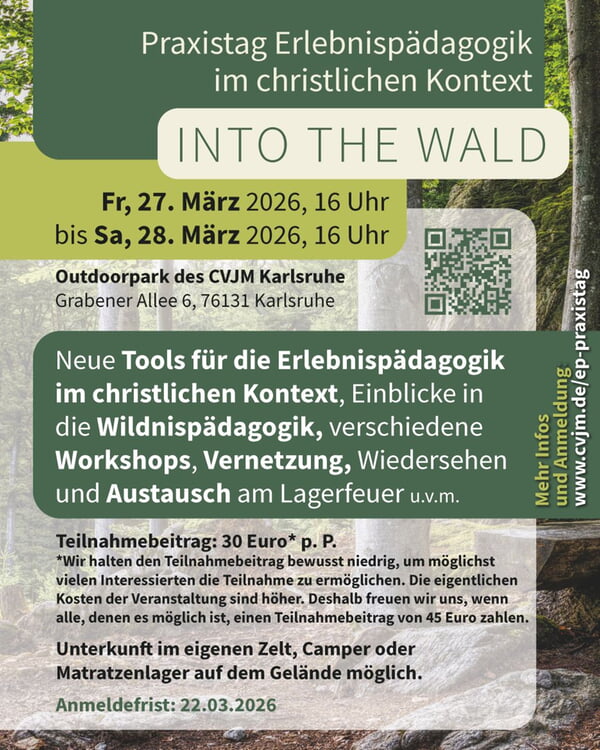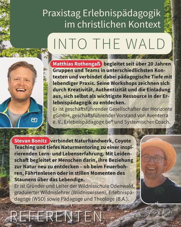 mit Matthias Rothengaß am Freitagabend - Wildnispädagogik – Lass dich von den Abenteuern in der Natur inspirieren und entdecke, wie gemeinschaftliche Aktivitäten und handwerkliche Techniken deine Kreativität entfalten können. Gemeinsam denken wir darüber nach, was wir als christliche Erlebnispädagog:innen von der Wildnispädagogik lernen können.